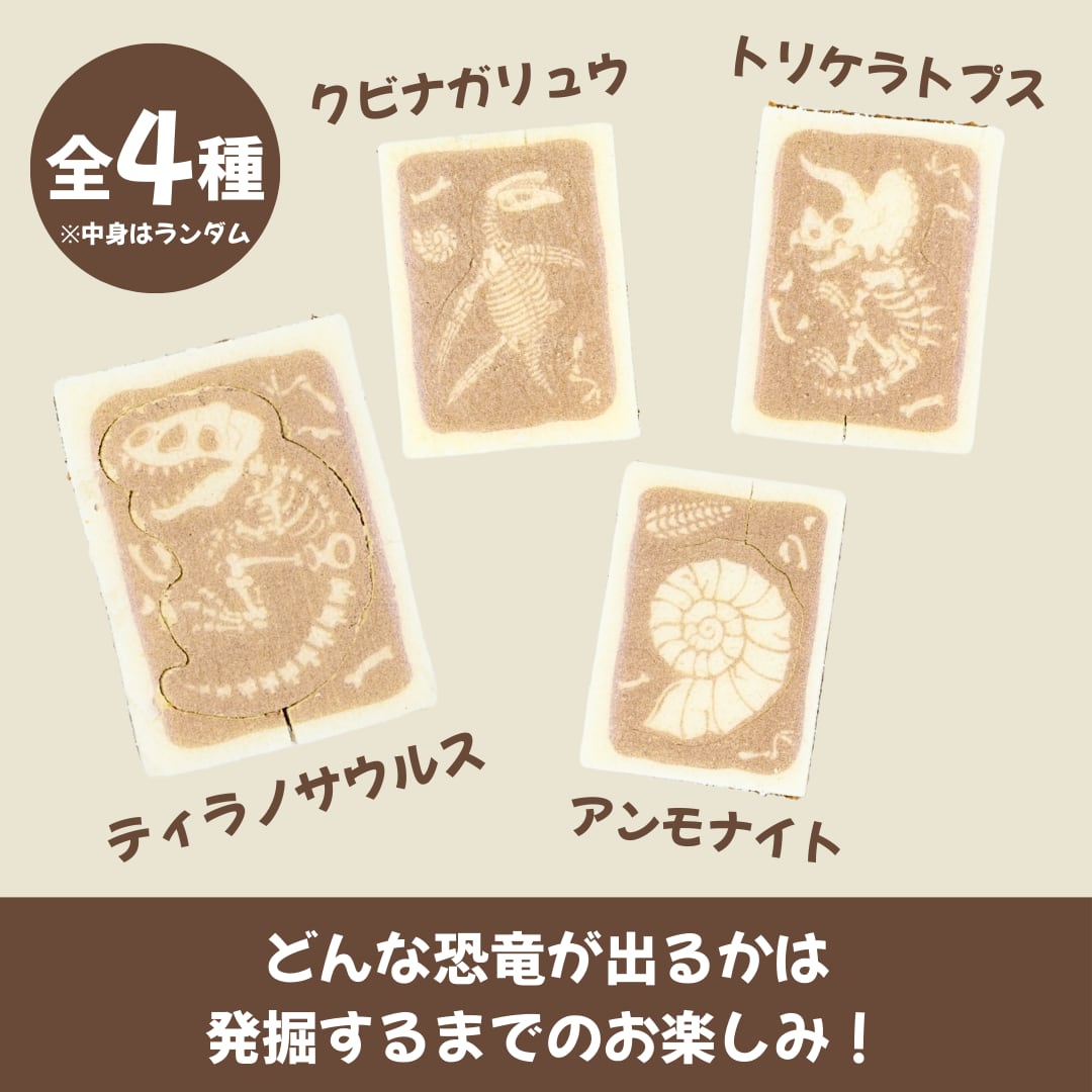 恐竜の種類は全4種類(ティラノサウルス/トリケラトプス/クビナガリュウ/アンモナイト)。