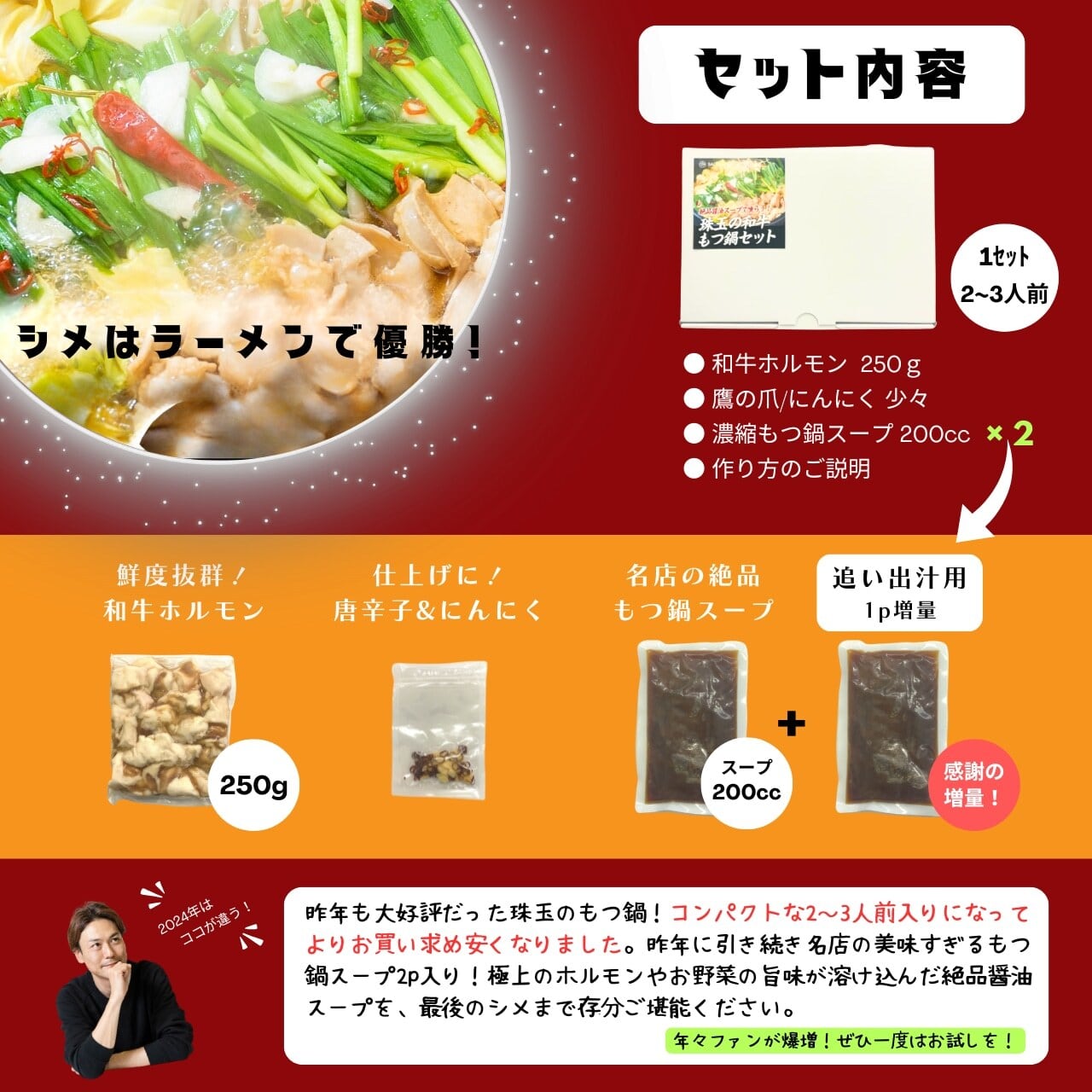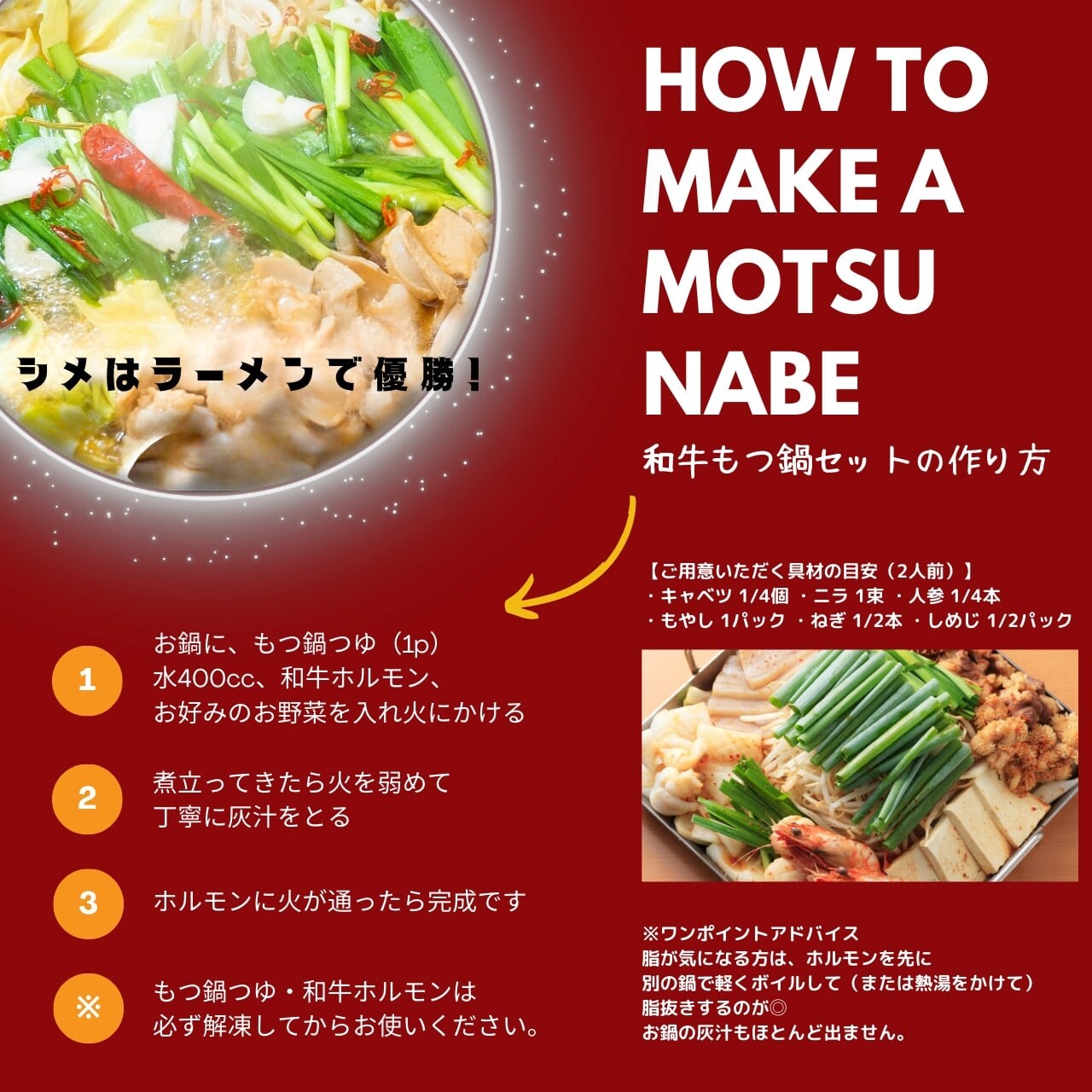 【内容量】もつ鍋スープ 200g×2、和牛ホルモン 250g、唐辛子/にんにく 少々