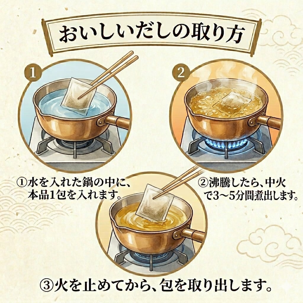 だしパックタイプなので、鍋に入れて煮出すだけ。