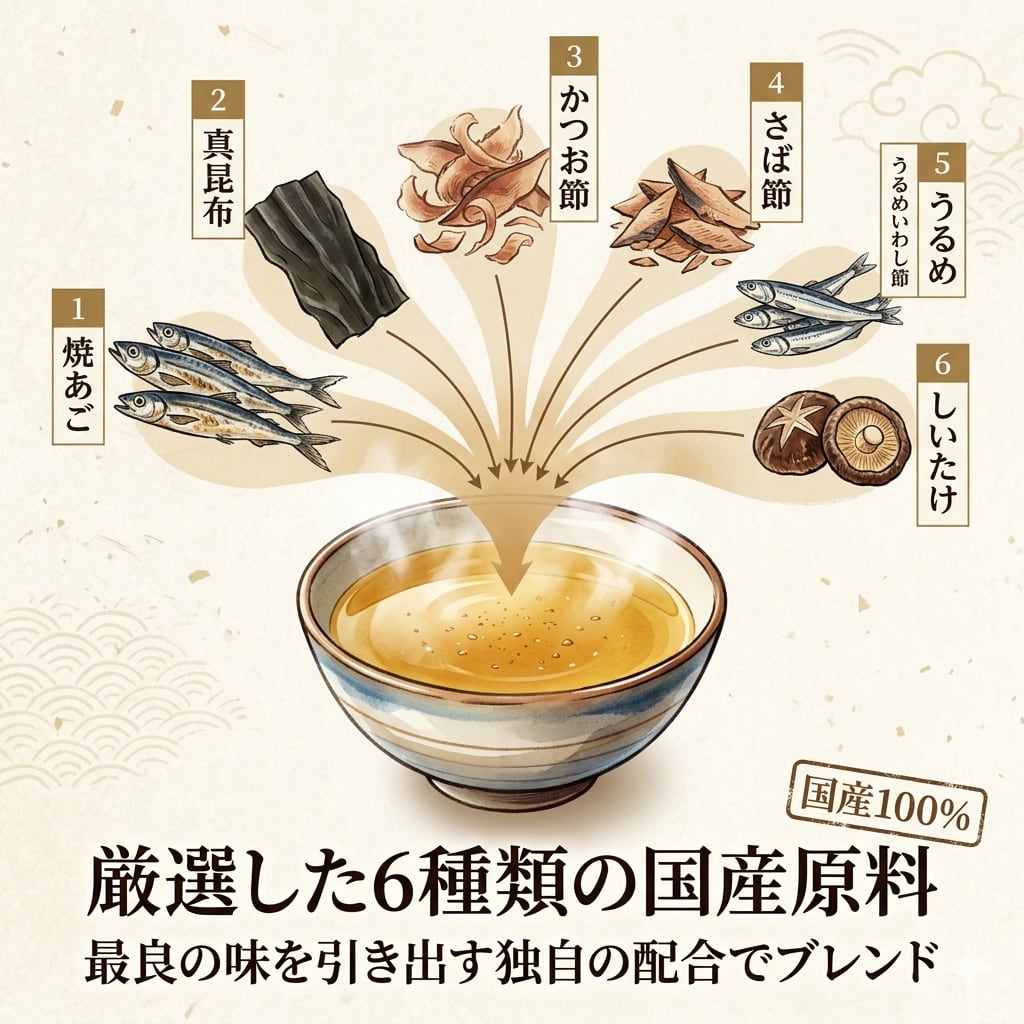 厳選した国産6素材を贅沢に使用した、風味豊かな和風だしです。