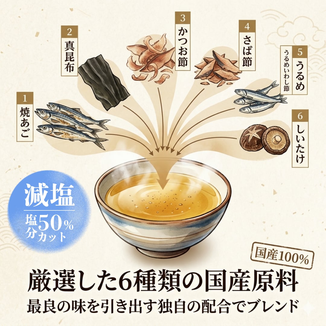 焼きあご、昆布、かつお節、さば節、うるめいわし節、しいたけの国産6素材を使用した本格和風だしを、毎日の食事にうれしい減塩仕様に仕上げました。