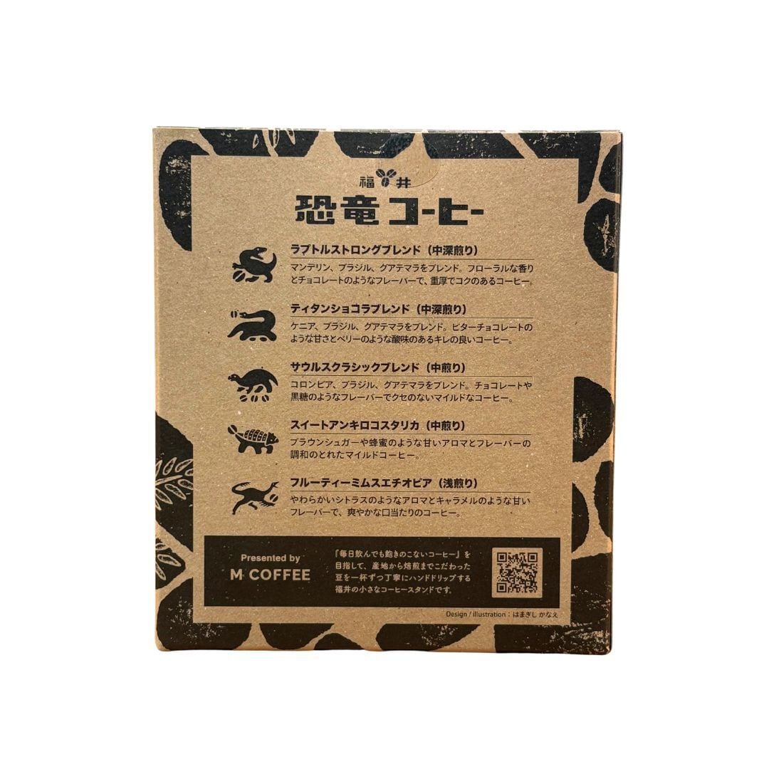 【内容量】10g×5パック(ラプトルストロングブレンド(中深煎り)×1、ティタンショコラブレンド(中深煎り)×1、サウルスクラシックブレンド(中煎り)×1、スイートアンキロコスタリカ(中煎り)×1、フルーティーミムスエチオピア(浅煎り)×1)