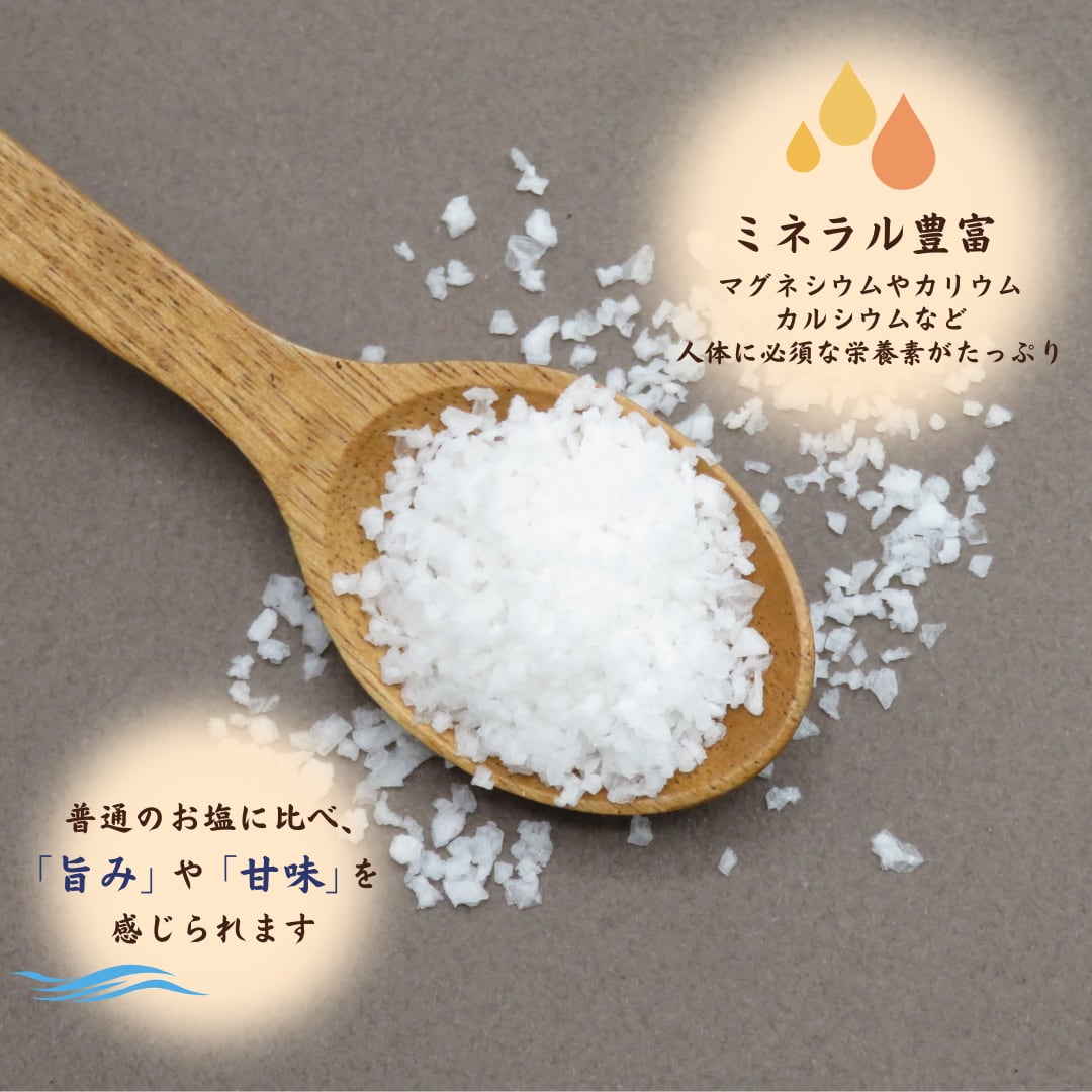 通常のお塩に比べ、人体に必要な栄養素を多く含んでおり、塩味だけではなく、旨みや甘味を感じられるのが特徴です。